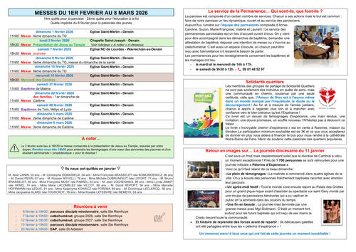Article publié par response.text()) .then(text => { html = text showLoading = false; })" class="flex justify-center animate-grow-on-hover--small">paroisse Sainte Remfroye • Publié le Vendredi 30 janvier 2026 - 12h41 • 15 visites feuille de fevrier 2026 A3 (1) Télécharger 4.9 Mo Télécharger